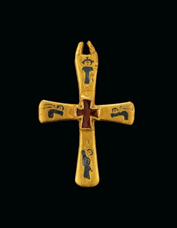 Στον χρυσό, βυζαντινό σταυρό, εκτός από το ένθετο σχήμα του σταυρού απεικονίζονται ο Χριστός, η Παναγία και δύο άγγελοι. Στην πίσω πλευρά και με ελληνικά γράμματα διαβάζουμε την επιγραφή «Άγιος Άγιος Κύριος Σαβαώθ», που είναι η αρχή του αρχαιότατου, επινίκιου ύμνου της χριστιανικής εκκλησιαστικής υμνολογίας, που ψάλλεται κατά την θεία λειτουργία. (Σύμφωνα με την Παλαιά Διαθήκη, Σαβαώθ είναι ένα από τα ονόματα του Θεού)