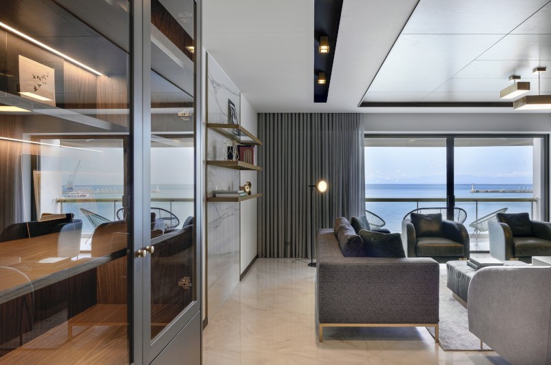 Καμβά για τη διαμόρφωση του νέου διαμερίσματος αποτέλεσαν τα υφιστάμενα μαρμάρινα δάπεδα. Ο χώρος του σαλονιού διαθέτει ονειρική θέα προς τη θάλασσα, που αποτελεί το «κλειδί» του σχεδιασμού.