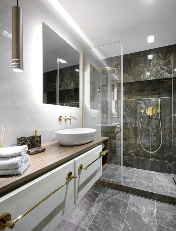 Ενιαίο αφήγημα στον χώρο δημιουργούν οι ξύλινες επενδύσεις σε οροφές και τοιχοποιίες, που κυριαρχούν, οι επενδύσεις μέρους της επίπλωσης και των τοιχοποιιών με πλακάκια μεγάλων διαστάσεων, οι μεταλλικές λεπτομέρειες και η χρωματική ενοποίηση.